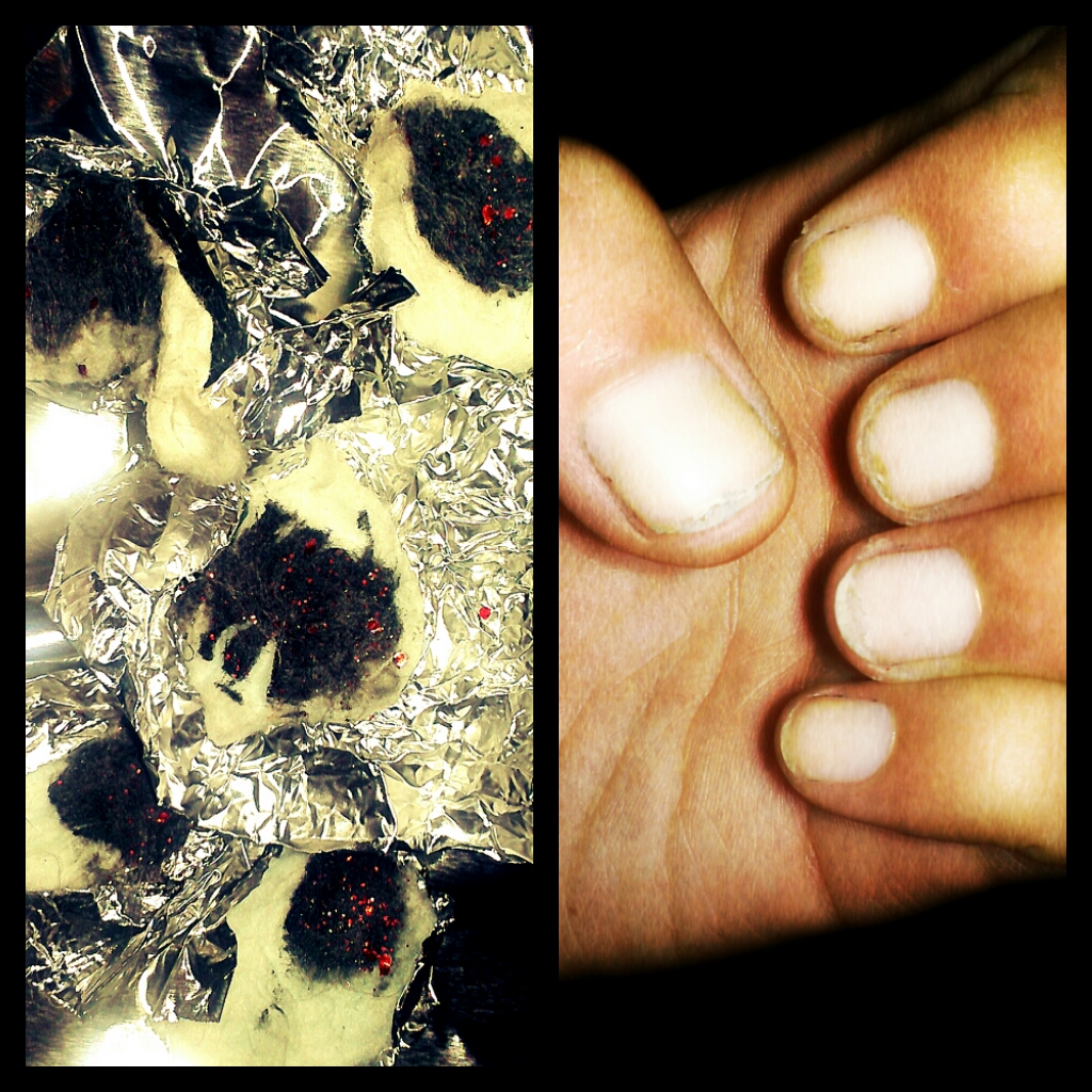- Soak cotton balls briefly in nail polish remover and place on top of glitter adorned nail