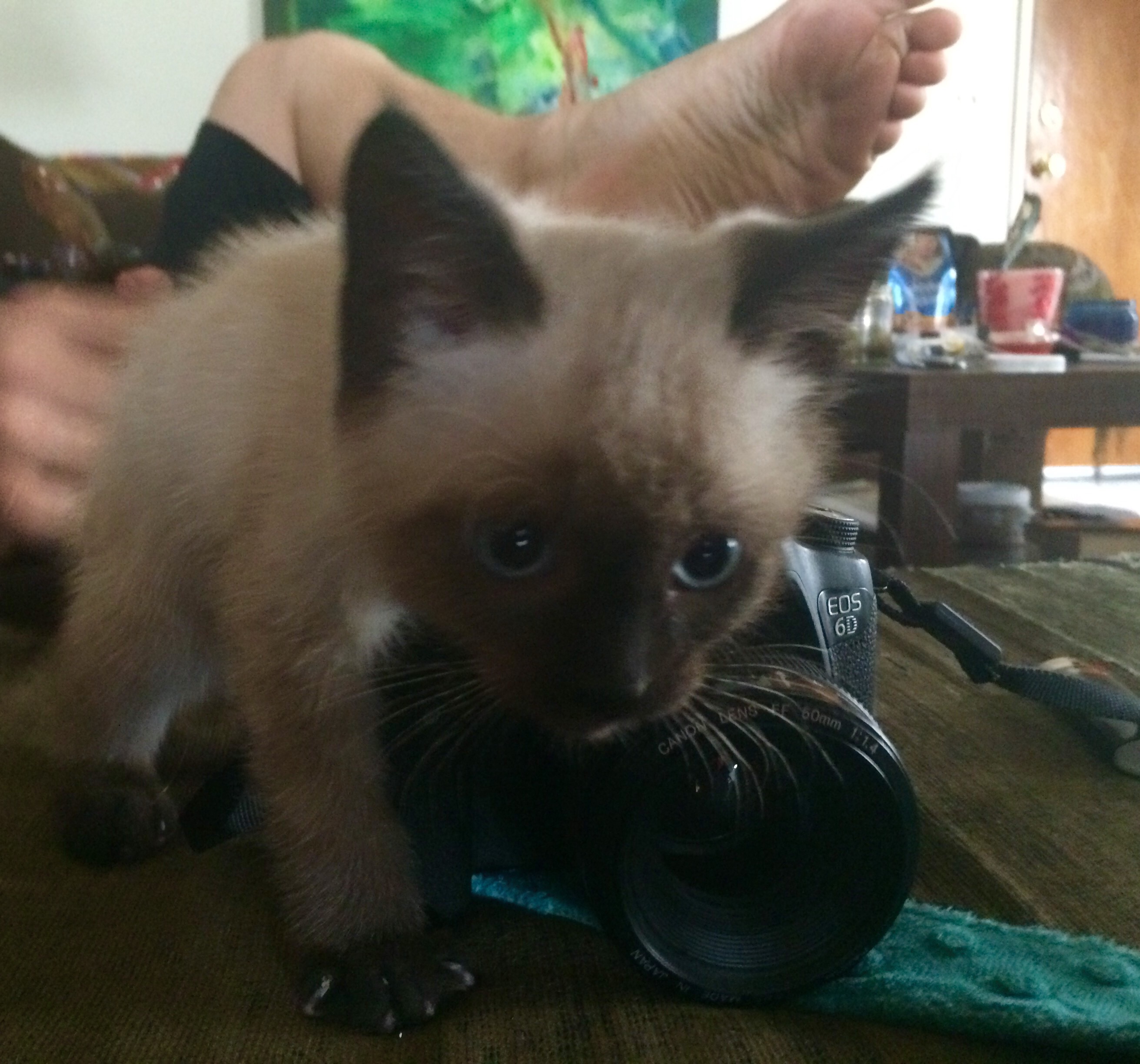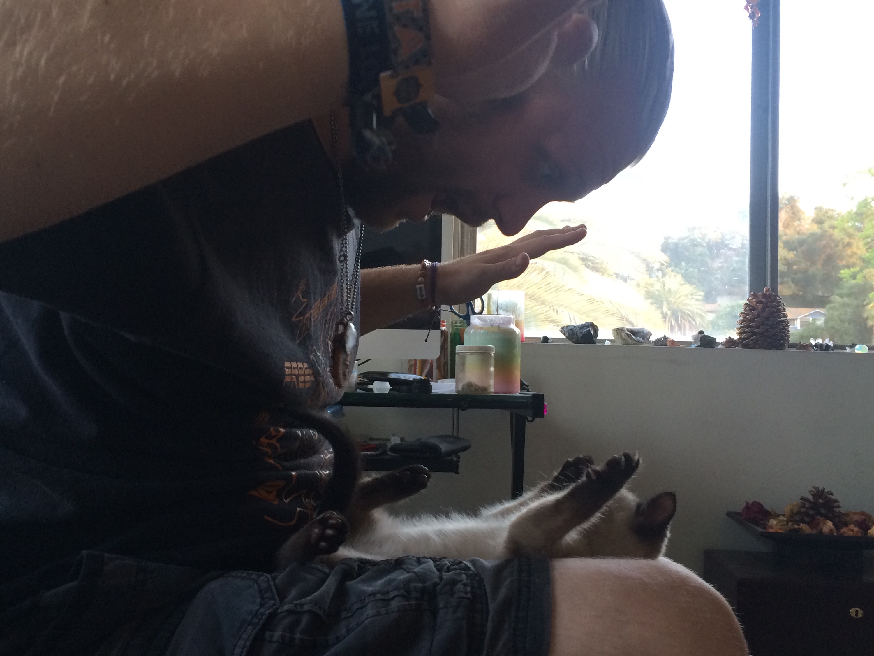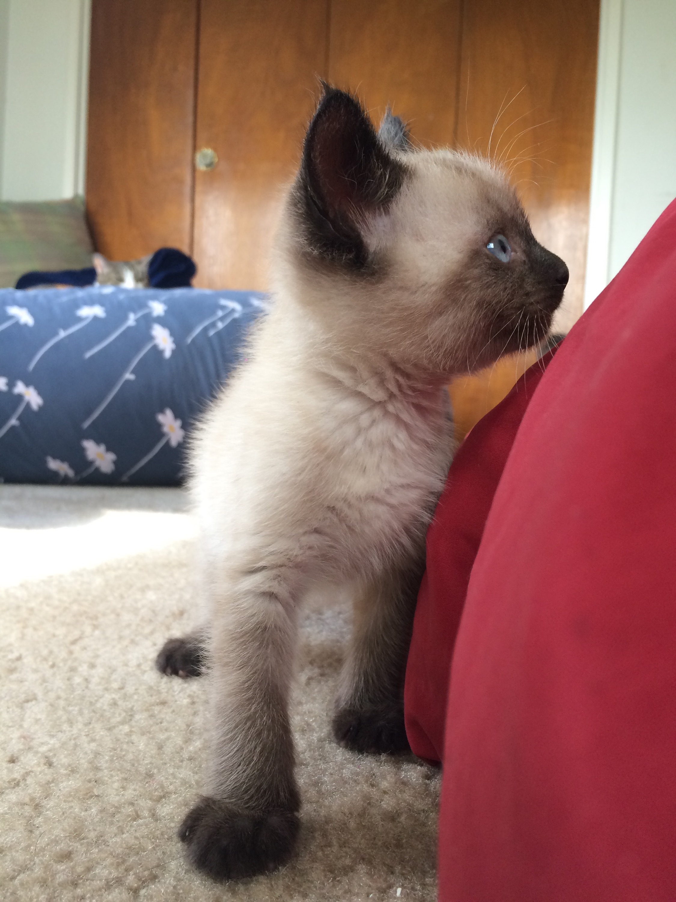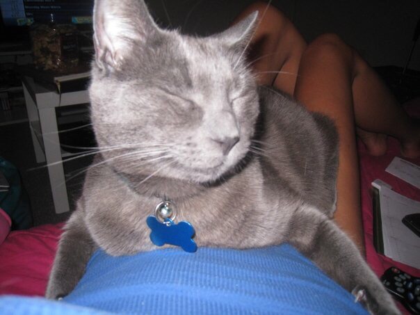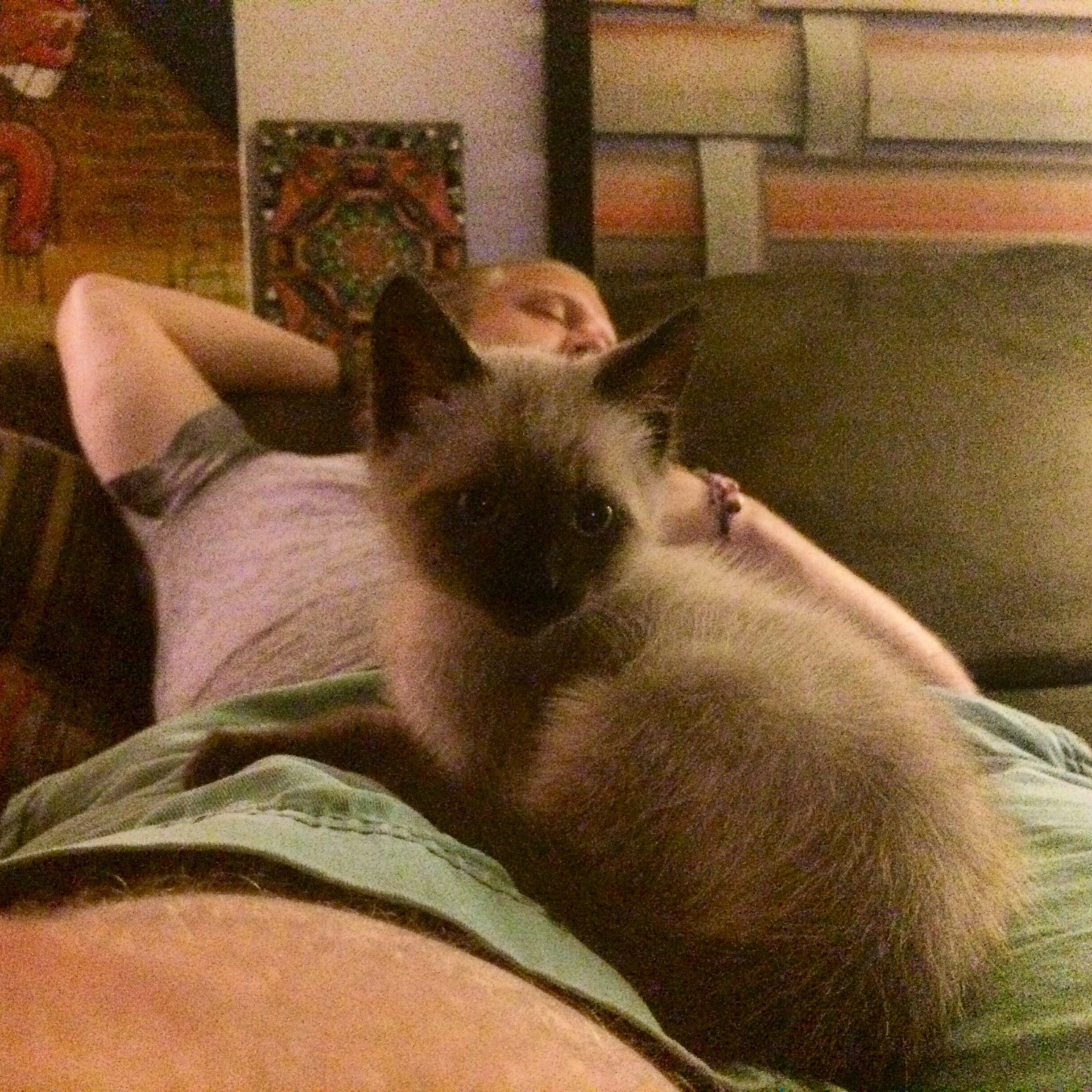 I glanced at an 8 month old Siamese that I immediately wanted to bring home, and a litter of orange tabby kittens not more than 2 weeks old. After getting to know me a bit, the young man working this room had a visceral lightbulb moment…“There’s a cat over here that I think will be perfect for you; he’s a little trickster and a lover.” As we walked over to the carrier, a beautiful blue-grey cat sat poised in the back of the cage. “No…” I mused “…what about the playful girl next to him?” The man smiled back “Why don’t you guys go into the play room, and if it’s not a good fit we can keep looking.”