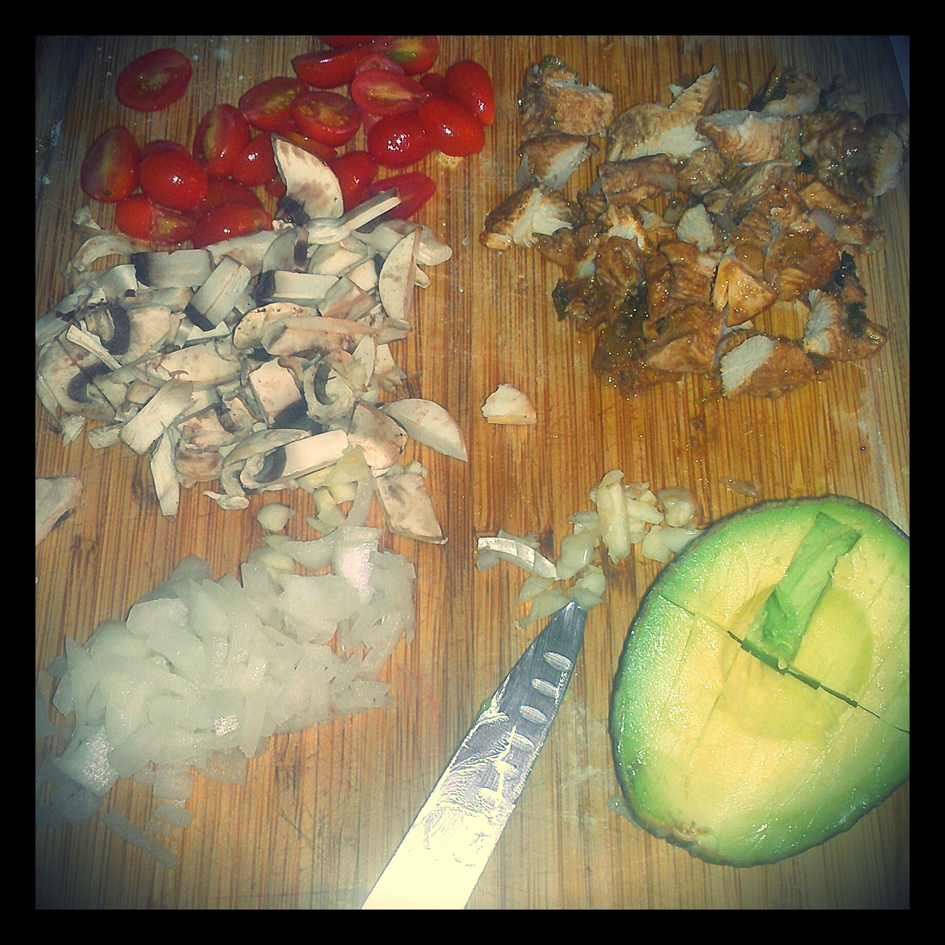 - While you’re waiting on your dough, cut up the vegetables and meat into bite size portions. It’s okay to sneak a few bites, I won’t tell!