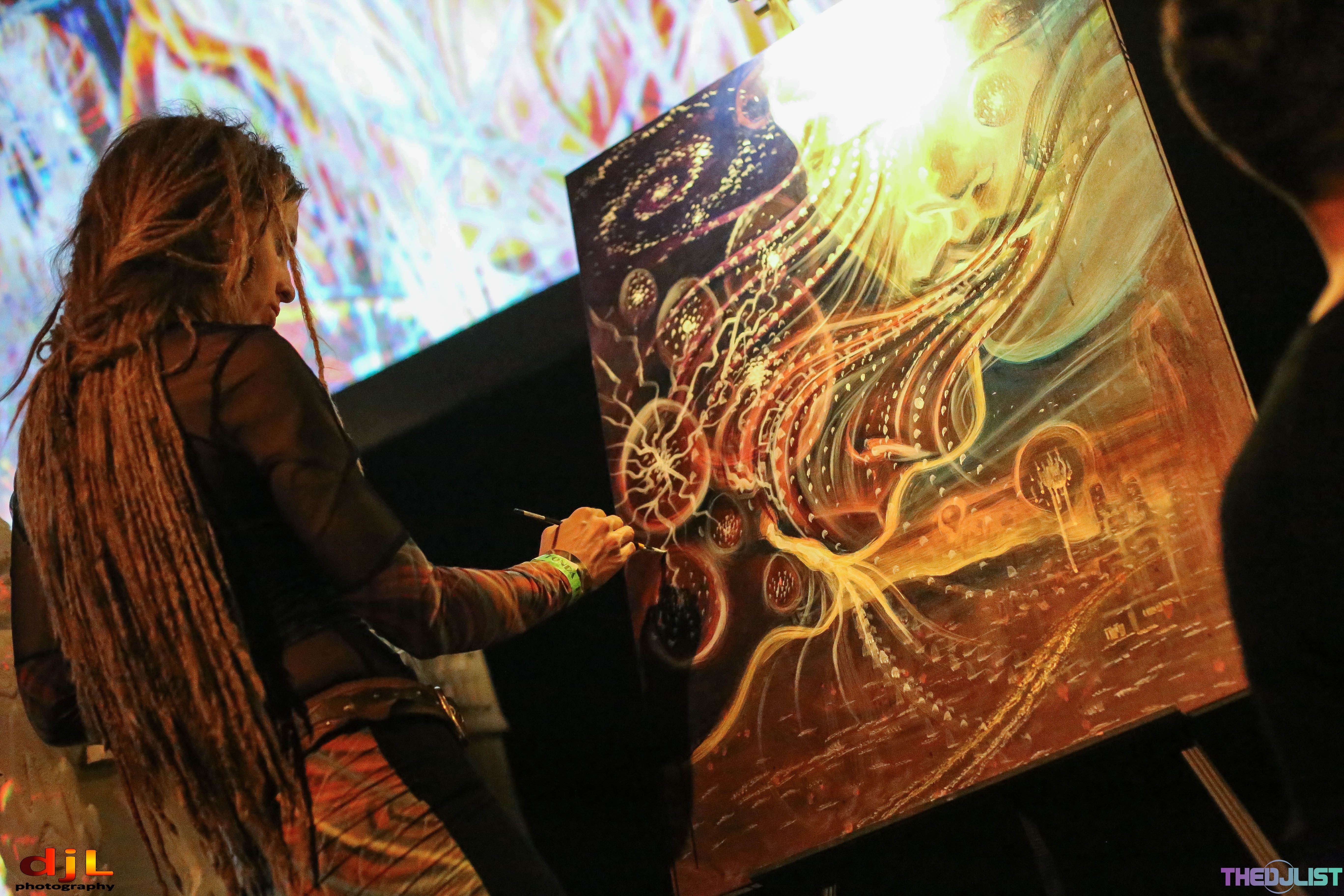 With Jonathan Singer setting a vibrantly trippy visual mood, Soulular set the tone for the evening with a stellar opening set as live visual artists Sam Flores, Amanda Sage, and Alex + Allyson Grey got down on live paintings much to the crowd’s delight.  Desert Dwellers followed with a downtempo ‘World Bass’ set, followed by the convoluted, glitchy dubstep sounds of Thriftworks, who got the crowd in a frenzy; the cherry on top of the ice cream sundae being an unexpected appearance by Russ Liquid on the Trumpet, eventually ebbing into Russ Liquid‘s flow.  My first Random Rab  experience was last Summer for a sunrise set at Lightning in a Bottle, so I had little to no idea of the musical prowess he had in store for the evening.  For almost two hours, the entire arena was transfixed to the sounds and visuals stemming from the Entheon Stage as we were swept down a rabbit hole of music and wonder.