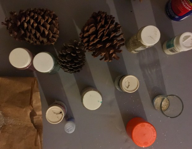 - In a small mixing cup, add any and all of the different glitters that you’re putting on the first pine cone
