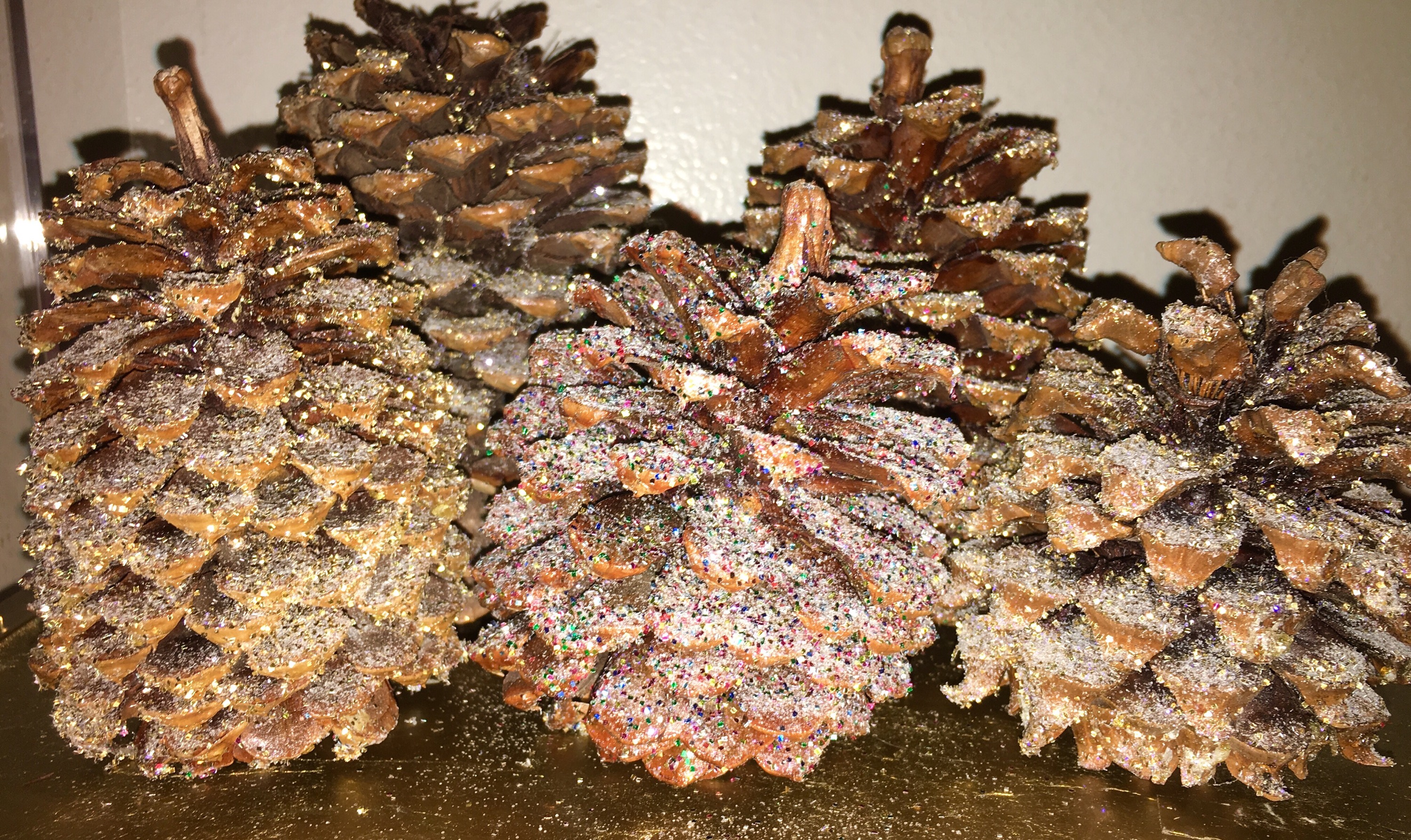 - Shake the can of spray glue and remove the plastic top, spray can on a third of the pine cone and loosely sprinkle enough glitter to cover the glue. Repeat on the rest of the pine cone.