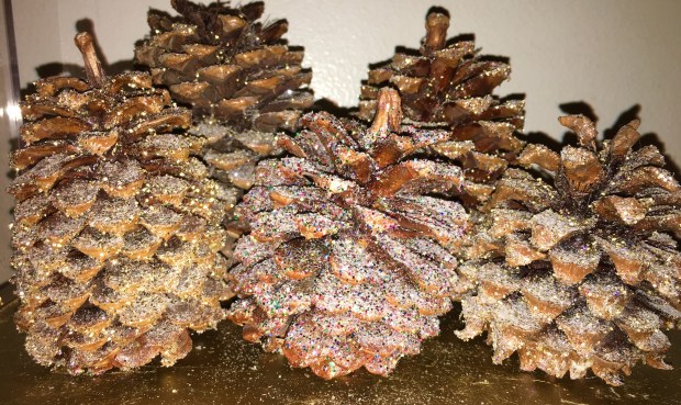 The great thing about the sparkly, seasonal pine cones is that they’re as easy to make as they sound and the result is beautiful any way you spin it!