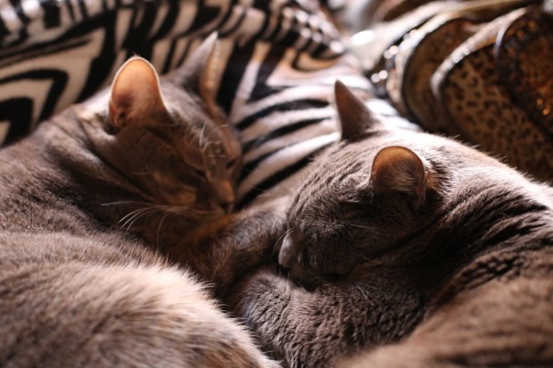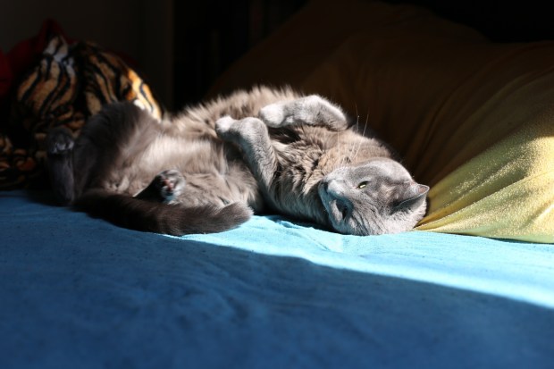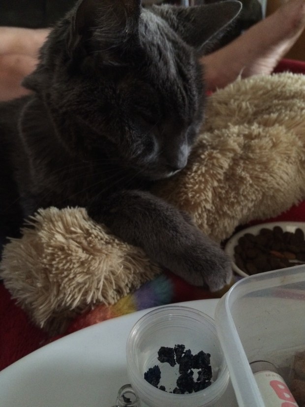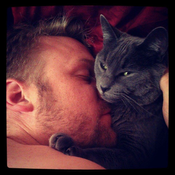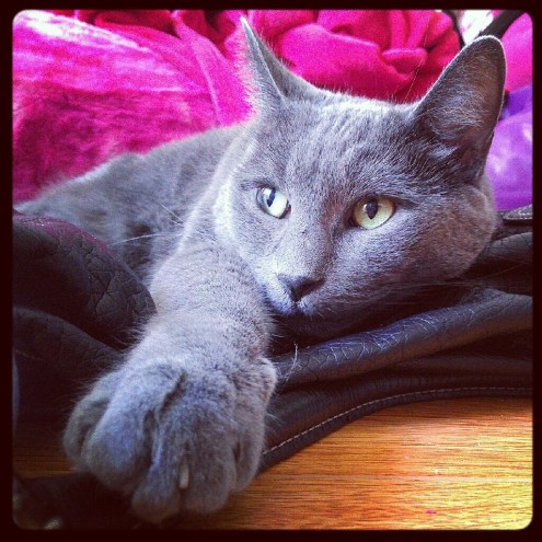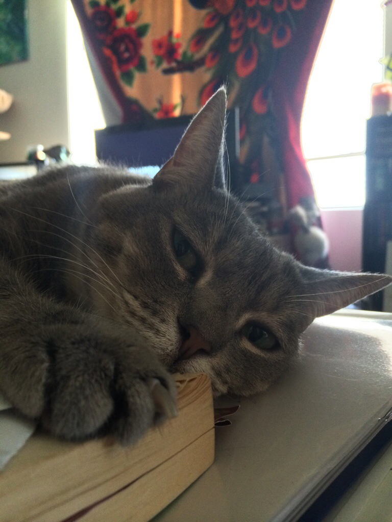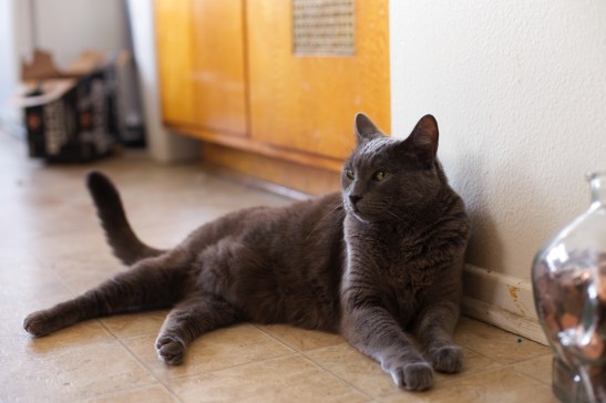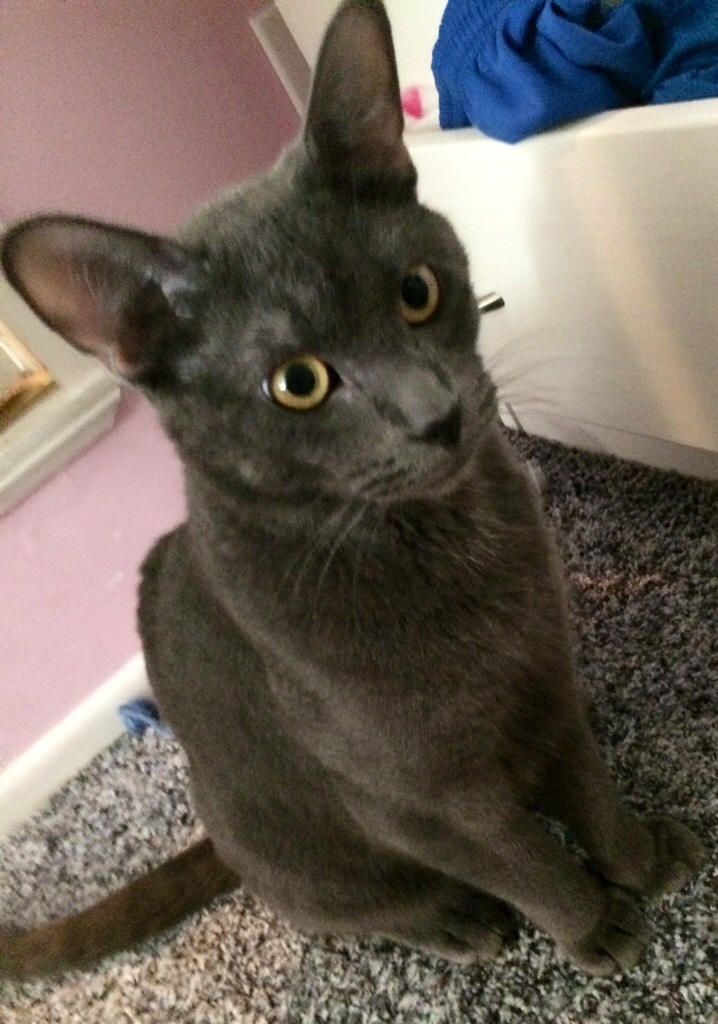 I glanced at an 8 month old Siamese that I immediately wanted to bring home, and a litter of orange tabby kittens not more than 2 weeks old. After getting to know me a bit, the young man working this room had a visceral lightbulb moment…“There’s a cat over here that I think will be perfect for you; he’s a little trickster and a lover.” As we walked over to the carrier, a beautiful blue-grey cat sat poised in the back of the cage. “No…” I mused “…what about the playful girl next to him?” The man smiled back “Why don’t you guys go into the play room, and if it’s not a good fit we can keep looking.”
